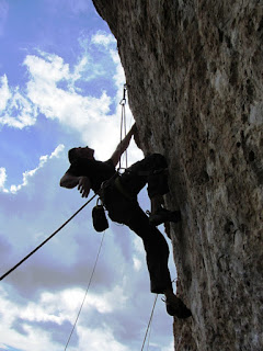 Voy a quitarle las telarañas a esto que ya es horita. Desde la última entrada han pasado muchas cosas... Después de unas dos semanitas especulando ya estamos en marcha y haciendo entrenos serios. Este finde pasado me escapo con el Presi del Pozo para Margalef a tomar contacto con la roca. Allí están Pablo (alias Ñu), María, Sil, Dani F. (para dos días que escalo y te vas esta te la guardo jaja), Lucía, Vicent, Renaud... Vaya dos días llenos de pegues fanáticos y mucha motivación... a destacar el grito y posterior rotpunk de María a un 7c+, la apisonadora Pablo llevándose consigo El Ball del trícpes, 8b, con pilastra incluída... eso ye un Ñu!! Farmas... mmmm... bien, performances estratosféricas con bufidos de ultratumba, Seta haciendo demos de bloqueo maestro... y por mi parte... bueno... vuelo sin motor en Ser purista me despista, 8a de Dani Fuertes, que me llevo al segundo y un buen on sight a El ladrón de orquídeas, 8a... y eso que me daba el sol de cara, menos mal que había unas 42 clecas marcando perfectamente el camino... bienvenido a los on sights de la nueva era.